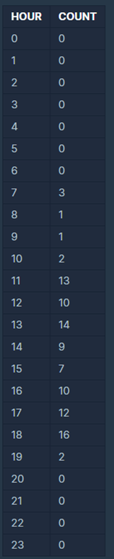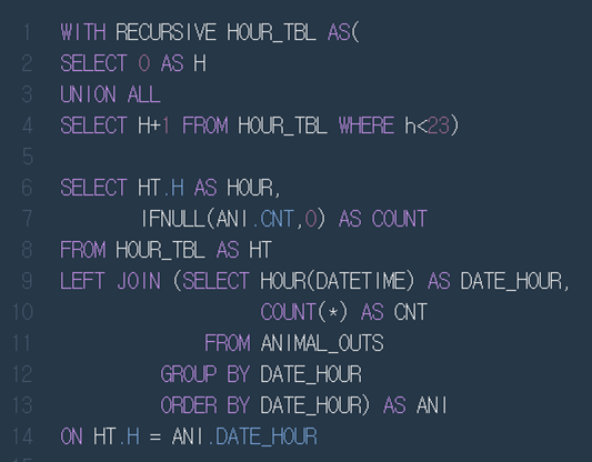 1) WITH RECURSIVE (WITH 재귀쿼리 계층구조) : H 컬럼에 0 부터 23까지의 레코드 값을 갖는 가상 테이블 생성 2) IFNULL(value, 0) : value가 NULL 일 경우 0을 반환 3) HOUR(date) : date의 시간값만 반환