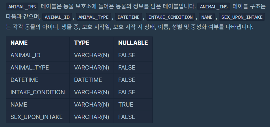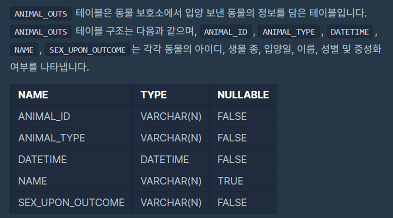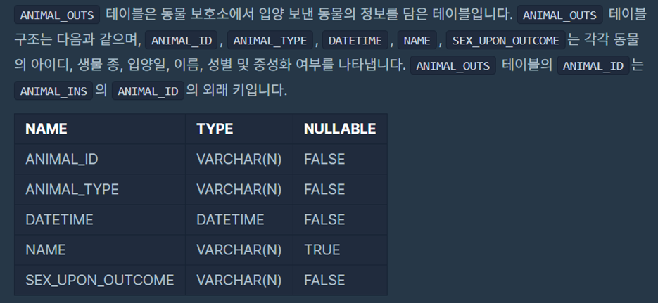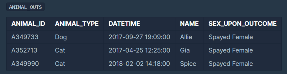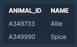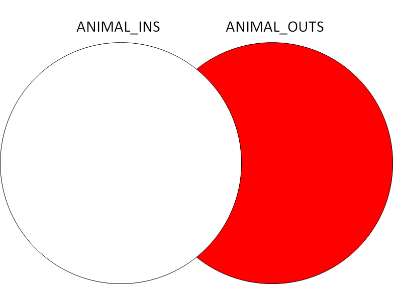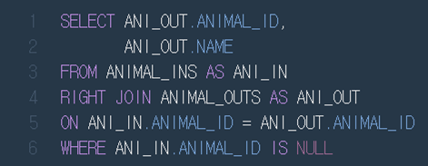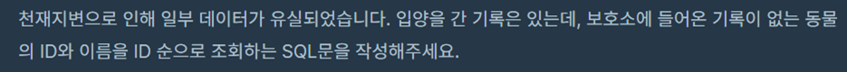 ANIMAL_OUTS 테이블 기준 1) Allie의 ID는 ANIMAL_INS에 없으므로, Allie의 데이터는 유실되었습니다. 2) Gia의 ID는 ANIMAL_INS에 있으므로, Gia의 데이터는 유실되지 않았습니다. 3) Spice의 ID는 ANIMAL_INS에 없으므로, Spice의 데이터는 유실되었습니다. ANIMAL_INS 테이블에는 존재하지않고, ANIMAL_OUTS 테이블에 존재하는 레코드를 찾기 위해 RIGHT JOIN 한다. 두 테이블에서 공통적으로 존재하는 레코드를 제외하고 조회한다.