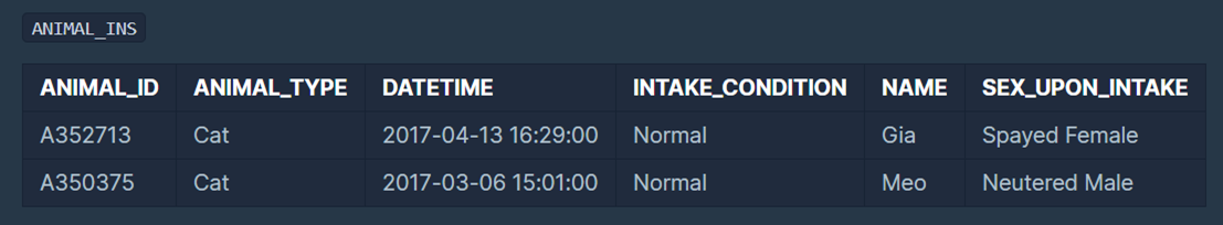 TIMESTAMPDIFF(before date, after date) 를 사용하여 ANIMAL_OUTS 테이블의 입양일 데이터와 ANIMAL_INS 테이블의 보호시작일 데이터를 초단위로 비교한 값을 기준으로 내림차순(보호 기간이 긴 순)정렬하여 상위 2 개 레코드만 조회