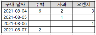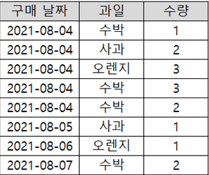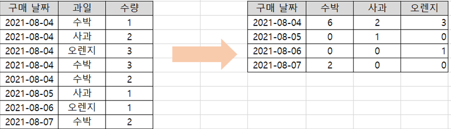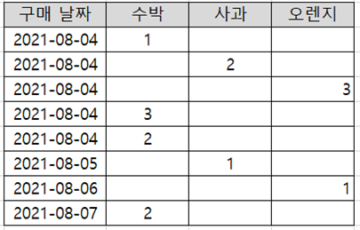 왼쪽은 과일이 판매될때 마다 작성한 데이터이고, 오른쪽은 구하고자 하는 결과 데이터이다.