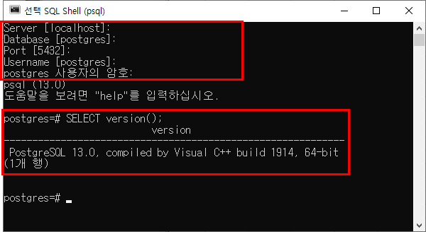 ▶ 아래와 같은 결과가 출력된다면 PostgreSQL 설치 완료!!!