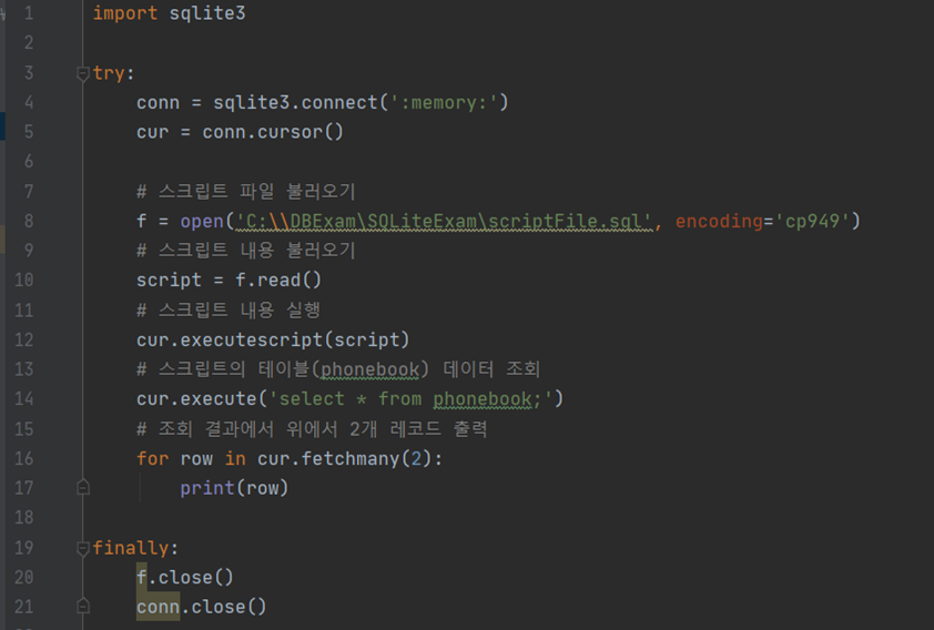Permalink Browse files [SQLite] 스크립트 내용을 트랜잭션에 적용 Loading branch information Showing 1 changed file with 22 additions and 0 deletions. +22 −0 SQLite/scriptMemoryExam.py @@ -0,0 +1,22 @@ import sqlite3 try: conn = sqlite3.conne
