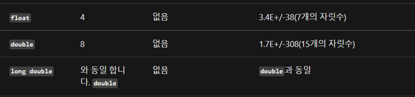 실수형 데이터 타입은 원주율(3.14..)과 같은 실수 데이터를 저장할 수 있으며, 전체 비트를 부호 비트, 지수 비트, 유효 숫자 비트로 구분하여 데이터를 저장하기 때문에 같은 바이트 대비 정수형 데이터보다 큰 가용범위의 값을 저장할 수 있다.