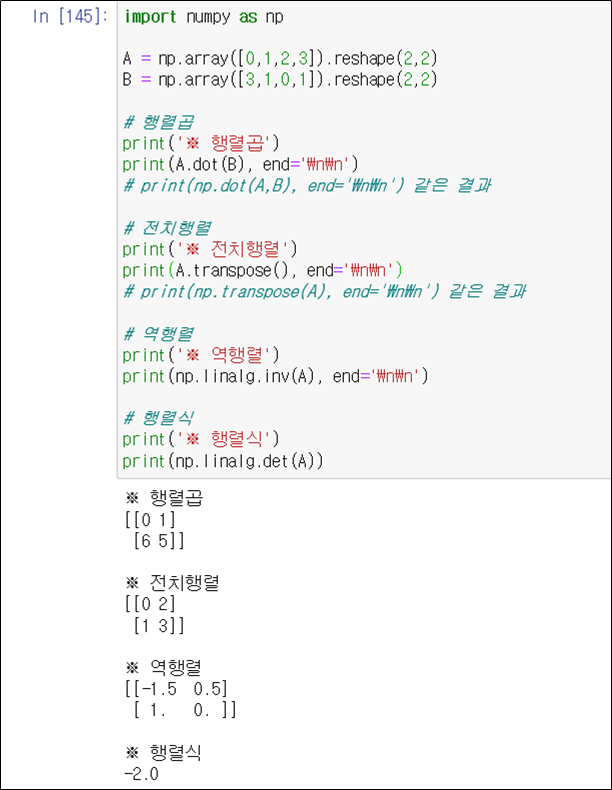 | 역행렬(inverse matrix) | np.linalg.inv(A) |